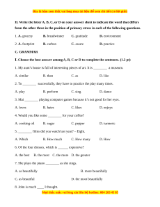 from the other three in the position of primary stress in each of the following questions. 1. A. grocery B. breadwinner C. gratitude D. environment 2. A. footprint B. carbon C. aware D. practice C. GRAMMAR