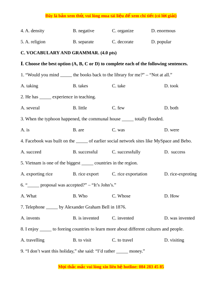 Đây là bản xem th , vu ử i lòng mua tài li u ệ đ xe ể m chi ti t (c ế ó l i ờ gi i ả ) 4. A. density B. negative C. organize D. enormous 5. A. religion B. separate C. decorate D. popular