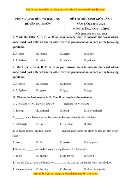 Đây là bản xem th , vu ử i lòng mua tài li u ệ đ xe ể m chi ti t ế (có l i ờ gi i ả ) PHÒNG GIÁO D C Ụ VÀ ĐÀO T O Ạ Đ Ề THI H C Ọ SINH GI I Ỏ L N Ầ 1 HUY N Ệ NGHI S N Ơ NĂM H C: Ọ 2019-2020 MÔN: TI NG Ế ANH – L P Ớ 6 Th i