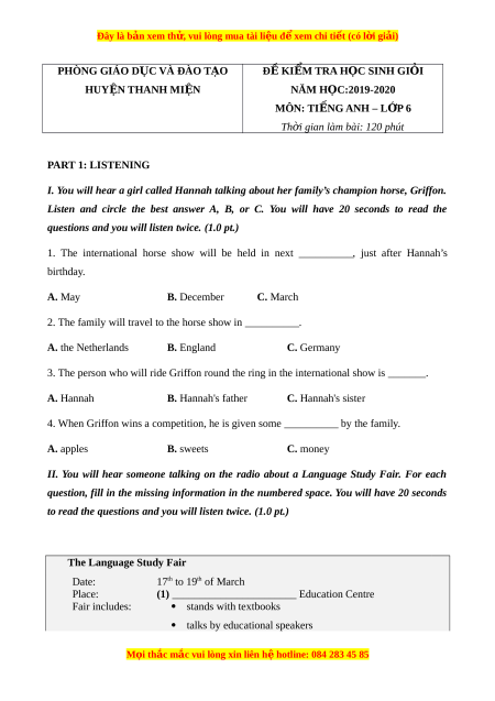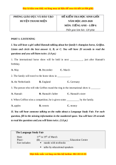 Đây là bản xem th , vu ử i lòng mua tài li u ệ đ xe ể m chi ti t ế (có l i ờ gi i ả ) PHÒNG GIÁO D C Ụ VÀ ĐÀO T O Ạ ĐỀ KI M Ể TRA H C Ọ SINH GI I Ỏ HUY N Ệ THANH MI N Ệ NĂM H C: Ọ 2019-2020 MÔN: TI NG Ế ANH – L P Ớ 6 Th i