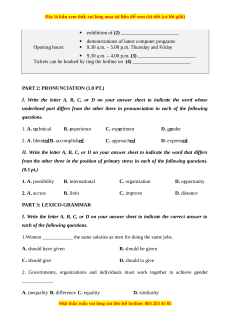 from the other three in the position of primary stress in each of the following questions. (0.5 pt.) 1. A. possibility B. international C. organization D. opportunity 2. A. access B. limit C. improve D. distance PART 3: LEXICO-GRAMMAR