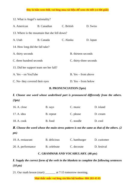 15. Did her support team see her fall? A. Yes – on YouTube B. Yes – from above C. No- they covered their eyes D. Yes – from below B. PRONUNCIATION (5pts)