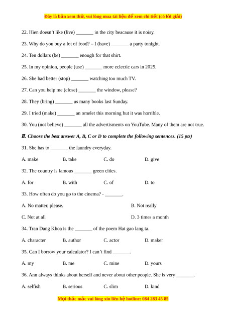 22. Hien doesn’t like (live) _______ in the city beacause it is noisy.