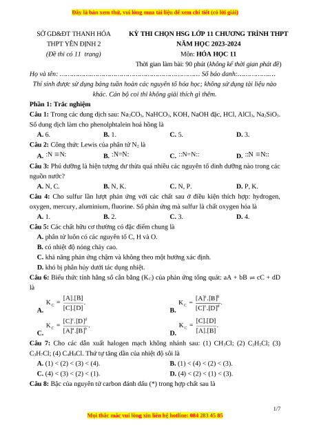KỲ THI CHỌN HSG LỚP 11 CHƯƠNG TRÌNH THPT THPT YÊN ĐỊNH 2 NĂM HỌC 2023-2024