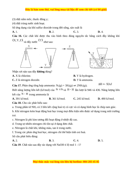Số ứng dụng của khí sulfur dioxide trong đời sống, sản xuất là A. 1. B. 2. C. 3. D. 4.
