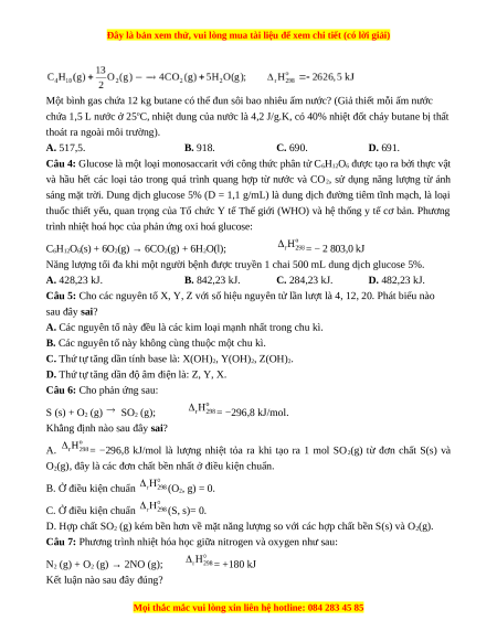 Câu 3: Phản ứng đốt cháy butane diễn ra như sau: