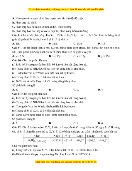 Câu 9: Hòa tan hoàn toàn x mol CuFeS2 bằng dung dịch HNO3 đặc, nóng (dư) sinh ra y mol