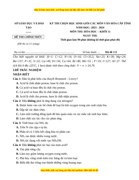 Họ và tên: ....................................................................... Số báo danh: .... Mã đề 111