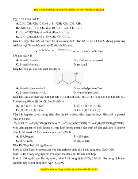 Câu 14: Aspirin có tác dụng giảm đau, hạ sốt, chống viêm. Aspirin được điều chế từ phenol theo sơ đồ sau: C6H5OH o–C6H4(ONa)(COONa) o–C6H4(OH)(COOH) o–C6H4(OCOCH3)(COOH)