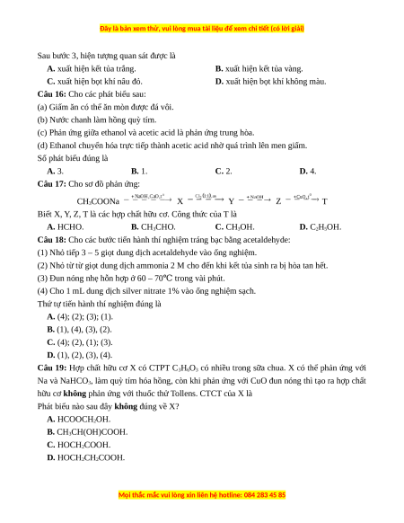 Câu 18: Cho các bước tiến hành thí nghiệm tráng bạc bằng acetaldehyde: