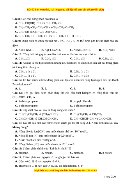 Câu 10: Công thức tổng quát của dẫn xuất monochlorine no, mạch hở là A. CnH2n+1Cl. B. CnH2n−3Cl. C. CnH2n−5Cl. D. CnH2n−1Cl.