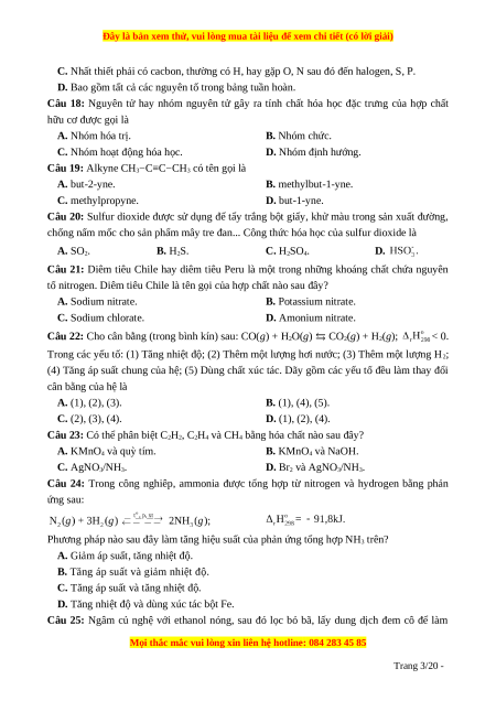 Câu 18: Nguyên tử hay nhóm nguyên tử gây ra tính chất hóa học đặc trưng của hợp chất hữu cơ được gọi là A. Nhóm hóa trị. B. Nhóm chức.