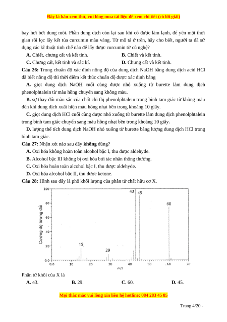 Câu 28: Hình sau đây là phổ khối lượng của phân tử chất hữu cơ X. Phân tử khối của X là A. 43. B. 29. C. 60. D. 45.