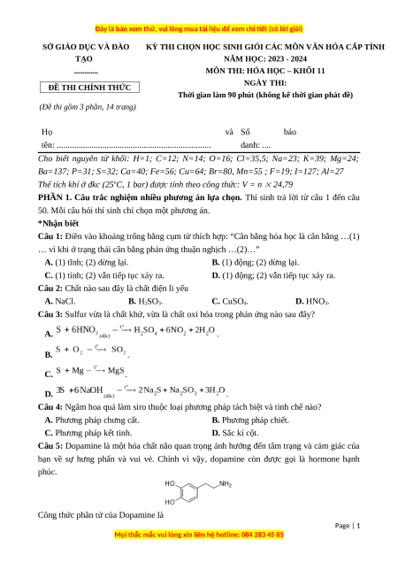 Đề thi HSG Hóa 11 năm 2023-2024 (Đề 5) có lời giải