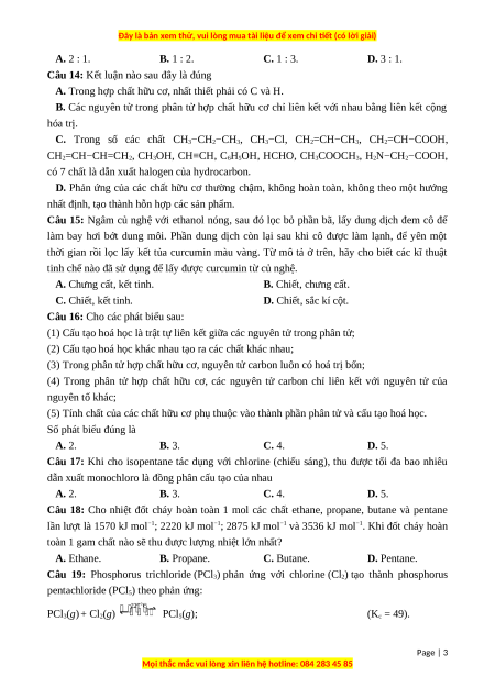 Câu 17: Khi cho isopentane tác dụng với chlorine (chiếu sáng), thu được tối đa bao nhiêu