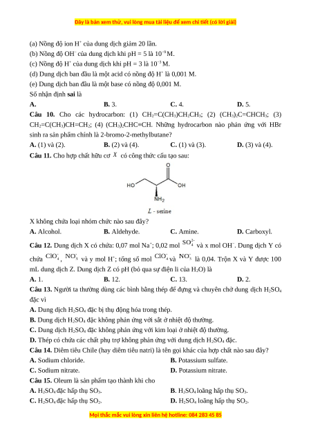 Câu 9. Giá trị pH của một dung dịch tăng từ 3 đến 5. Cho các nhận định sau: