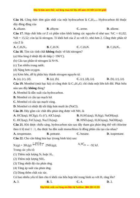 Câu 22. Cho cân bằng hóa học (trong bình kín) sau: N2(g) + 3H2(g) 2NH3(g); = −92 kJ. Trong các yếu tố: