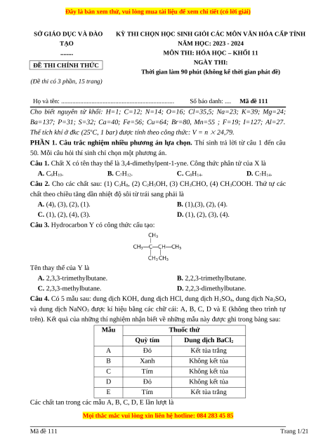 Đề thi HSG Hóa 11 năm 2023-2024 (Đề 8) có lời giải