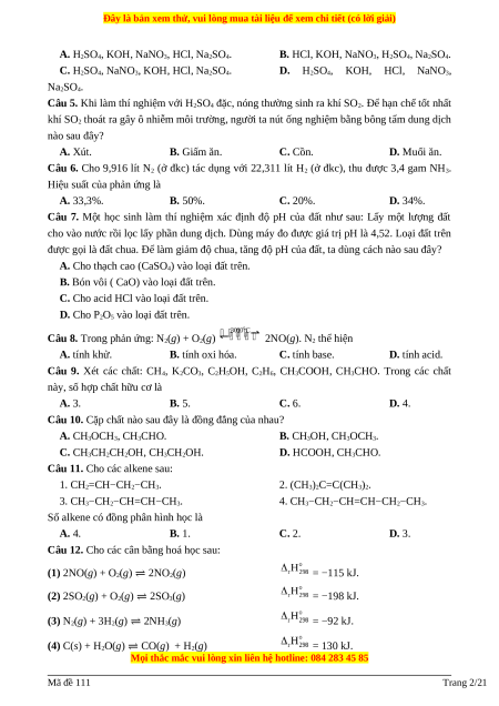 Câu 5. Khi làm thí nghiệm với H2SO4 đặc, nóng thường sinh ra khí SO2. Để hạn chế tốt nhất