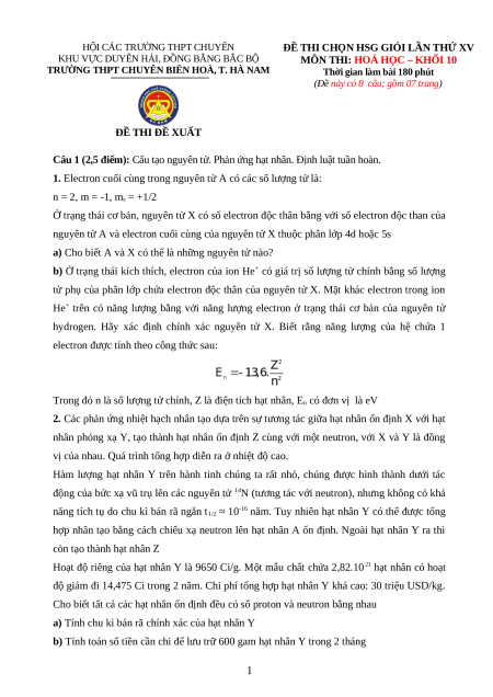 Đề thi HSG Hóa học 10 Trường THPT Chuyên Biên Hòa - Hà Nam