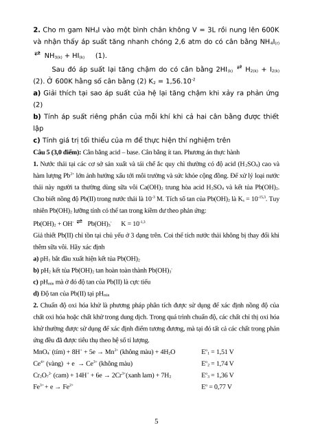 Câu 4 (3,0 điểm): Động hoá học (Không có cơ chế). Cân bằng hoá học trong pha khí.