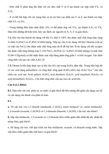 7.1. Các nguyên tố hóa học X,Y, Z có cùng số electron hóa trị, nhưng chu kì và có các tính chất sau: