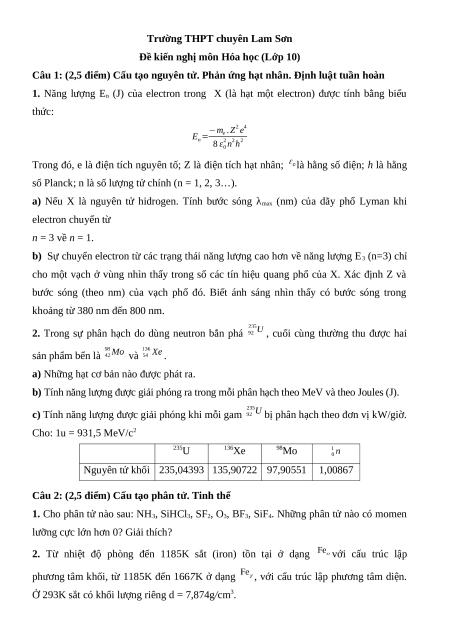 Câu 1: (2,5 điểm) Cấu tạo nguyên tử. Phản ứng hạt nhân. Định luật tuần hoàn