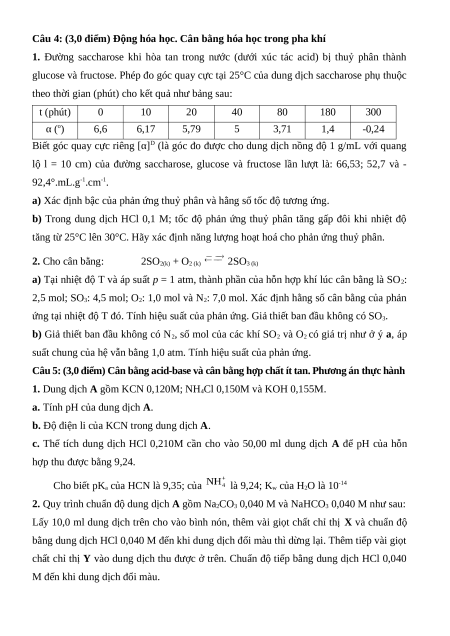 Câu 4: (3,0 điểm) Động hóa học. Cân bằng hóa học trong pha khí