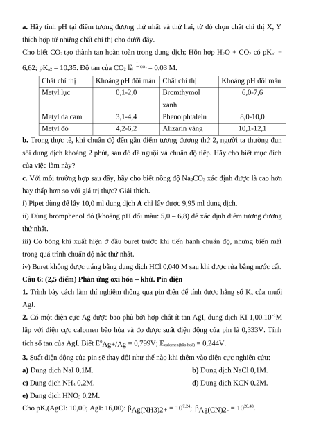 6,62; pKa2 = 10,35. Độ tan của CO2 là = 0,03 M. Chất chỉ thị