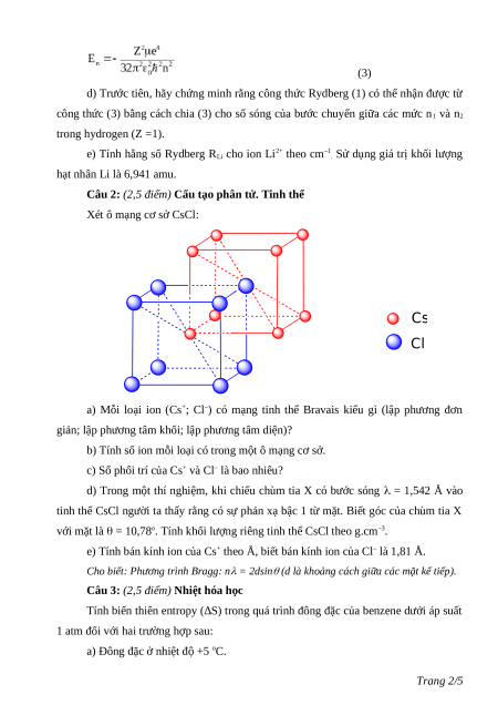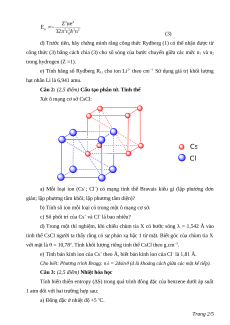 Câu 2: (2,5 điểm) Cấu tạo phân tử. Tinh thể Xét ô mạng cơ sở CsCl: Cs Cl