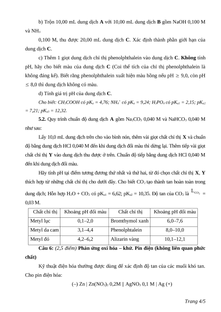 Câu 5: (3,0 điểm) Cân bằng acid – base và cân bằng các hợp chất ít tan.