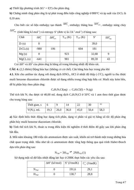 (tính bằng kJ.mol-1) và entropy So (đơn vị là J.K-1.mol-1) ở bảng sau: Chất Tmp (K) Tsub (K) So Zr (s) 0 39,0 ZrCl4 (s) -980 106 604 181 Mg (s) 0 923 32,68 9 MgCl2 (s) -641 981 89,59 43