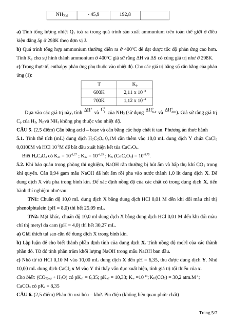 Sử dụng một số dữ liệu nhiệt động lực học ở 298K thực hiện các yêu cầu sau: ΔHo (kJ/mol) So (J/molK) N2(g) 0 191,6 29,1 H2(g) 0 130,7 28,8 Trang 4/7