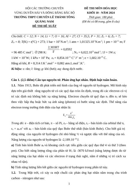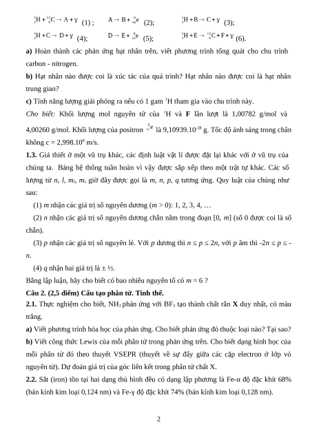 Câu 1. (2,5 điểm) Cấu tạo nguyên tử. Phản ứng hạt nhân. Định luật tuần hoàn.