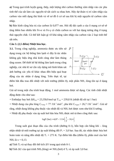 b) Tính ΔU của quá trình NH3 (lỏng) ⇌ NH3 (hơi) ở T0 và áp suất 3,0 bar. 3