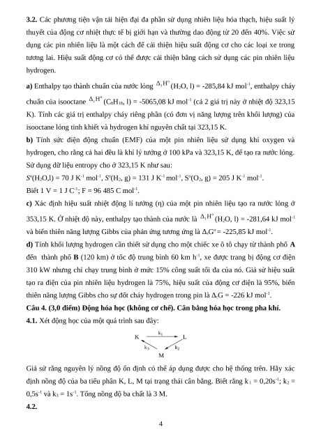 Câu 4. (3,0 điểm) Động hóa học (không cơ chế). Cân bằng hóa học trong pha khí.