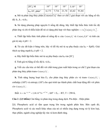 Câu 2. (2,5 điểm) Cân bằng và phản ứng trong dung dịch. Pin điện – Điện phân