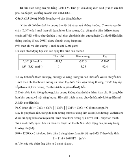 Câu 3. (2,5 điểm) Nhiệt động học và cân bằng hóa học.