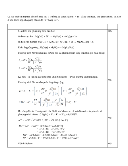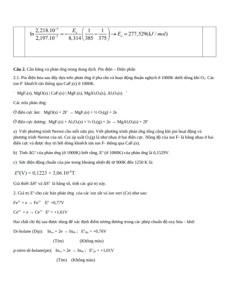 phương trình Nernst của nó. Coi áp suất O2(g) là như nhau ở hai điện cực. Nồng độ của ion F- là bằng nhau ở hai