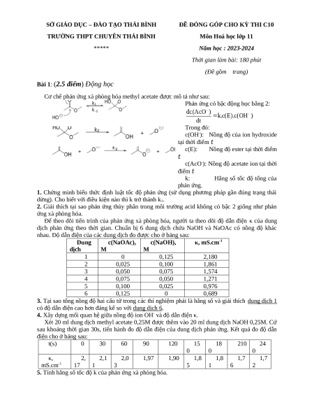 Đề thi HSG Hóa học 11 Trường THPT Chuyên Thái Bình
