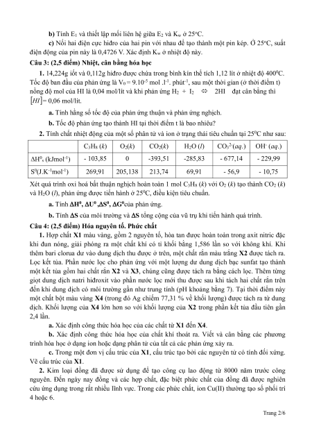 2. Tính chất nhiệt động của một số phân tử và ion ở trạng thái tiêu chuẩn tại 250C như sau: C3H8 (k) O2(k) CO2(k) H2O (l) CO32-(aq.) OH- (aq.) H0s (kJmol-1) - 103,85 0 -393,51 -285,83 - 677,14 - 229,99 S0(J.K-1mol-1) 269,91 205,138 213,74 69,91 - 56,9 - 10,75