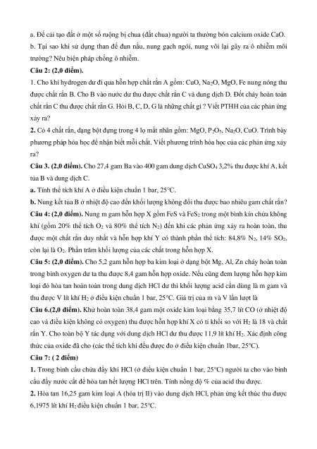 thức của oxide đã cho (các thể tích khí đều được đo ở điều kiện chuẩn 1bar, 25℃). Câu 7: ( 2 điểm)