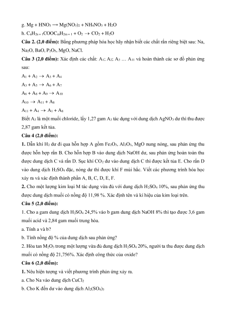 Câu 3 (2,0 điểm): Xác định các chất: A1; A2; A3 … A11 và hoàn thành các sơ đồ phản ứng sau: A1 + A2 → A3 + A4 A3 + A5 → A6 + A7 A → 6 + A8 + A9 A10 A10 → A11 + A8 A11 + A4 → A1 + A8