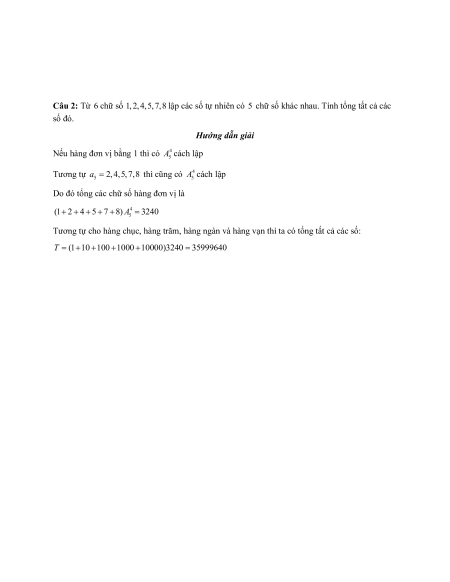 Câu 2: Từ 6 chữ số 1,2,4,5,7,8 lập các số tự nhiên có 5 chữ số khác nhau. Tính tổng tất cả các số đó.