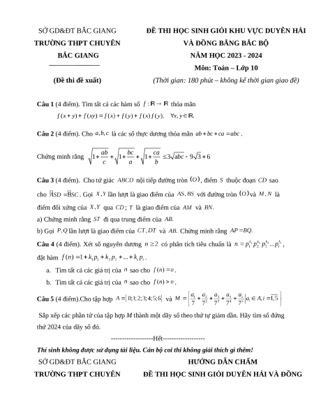ĐỀ THI HỌC SINH GIỎI DUYÊN HẢI VÀ ĐỒNG BẮC GIANG BẰNG BẮC BỘ NĂM HỌC 2023 - 2024