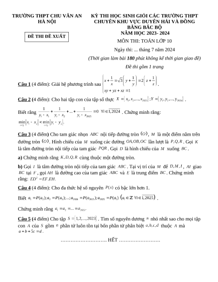 CHUYÊN KHU VỰC DUYÊN HẢI VÀ ĐỒNG BẰNG BẮC BỘ NĂM HỌC 2023- 2024 ĐỀ THI ĐỀ XUẤT MÔN THI: TOÁN LỚP 10