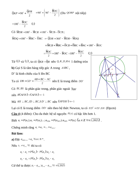 a) Giả sử vị trí các điểm như hình (trường hợp khác cmtt) Ta có: nên nội tiếp nên 1 đường tròn nên nội tiếp Do K là tâm nội tiếp nên: (Do nội tiếp) Có ; Từ và , ta có nên 1 đường tròn