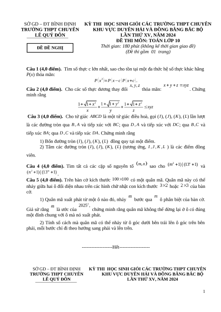 Đề thi HSG Toán 10 Trường THPT Chuyên Lê Quý Đôn - Bình Định