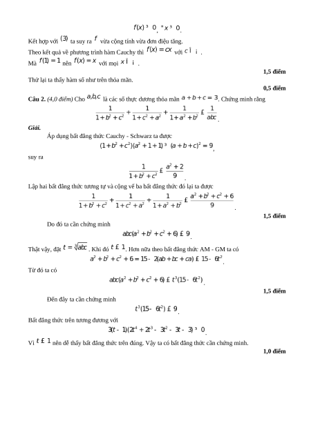 Theo kết quả về phương trình hàm Cauchy thì với . Mà nên với mọi . 1,5 điểm