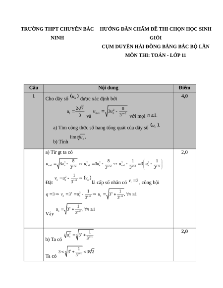 MÔN THI: TOÁN - LỚP 11 Câu Nội dung Điểm 1 Cho dãy số được xác định bởi 4,0 và với mọi